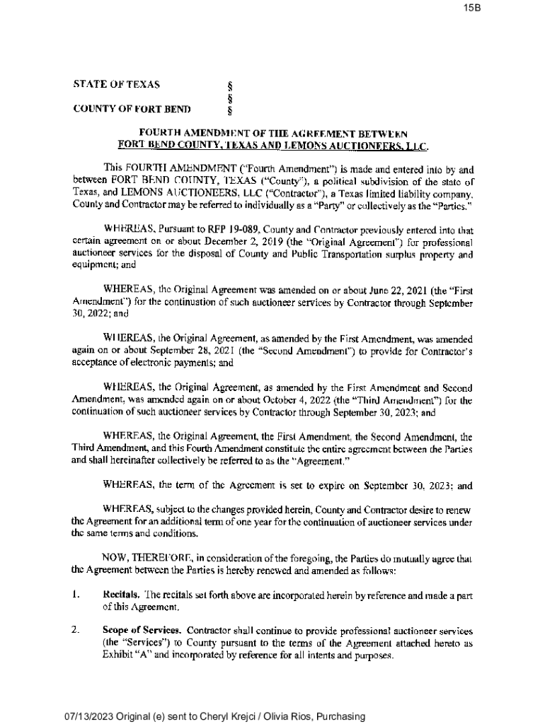 15BSTATE OF TEXAS COUNTY OF FORT BEDWORTH AMENDMENT OF THE AGREEMENT BETWEEN FORT BEND COUNTY, TEXAS AND LEMONS AUCTIONEERS. LLC. This FOURTH AMENDMENT (\”Fourth Amendment\”) is made and entered
