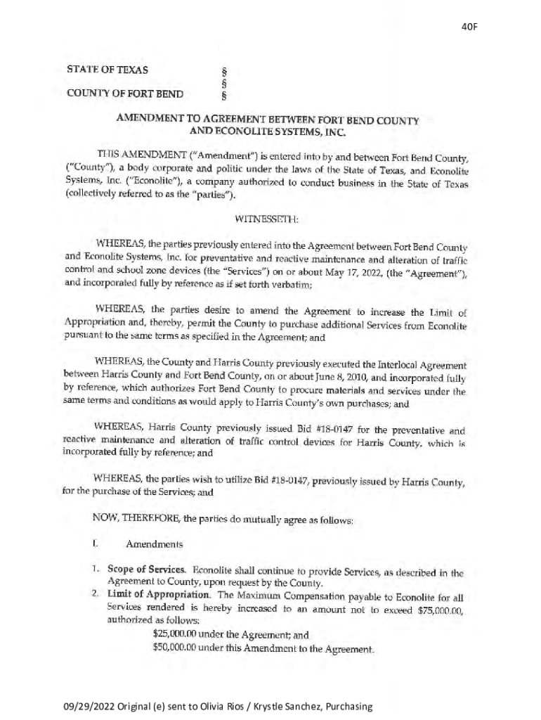40FSTATE OF TEXASCOUNTY OF FORT BEND AMENDMENT TO AGREEMENT BETWEEN FORT BEND COUNTY AND ECONOMIZE SYSTEMS, INC. THIS Amends MEET(\”Amendment\'\') JS entered into by and between Fort Bend County,