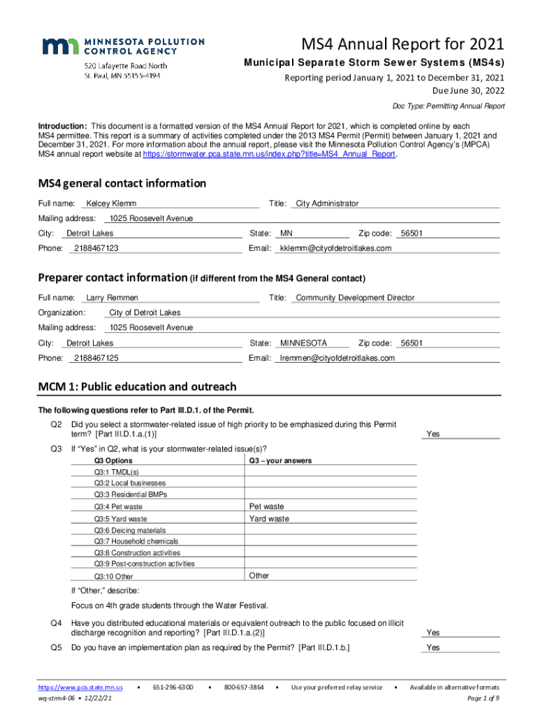 MS4 Annual Report for 2021Municipal Separate Storm Sewer Systems (MS4s) Reporting period January 1, 2021, to December 31, 2021, Due June 30, 2022, Doc Type: Permitting Annual ReportIntroduction: This