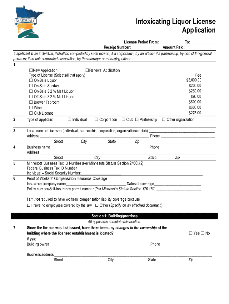 Intoxicating Liquor License Application License Period From: ___ To: ___ Receipt Number: ___ Amount Paid: ___ If applicant is an individual, it shall be completed by such person; if a corporation,