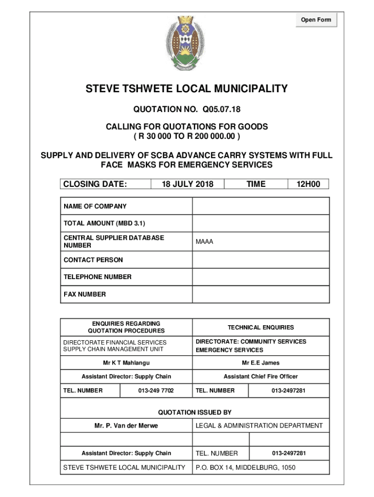 Open Formative THERE LOCAL MUNICIPALITY QUOTATION NO. Q05.07.18 CALLING FOR QUOTATIONS FOR GOODS (R 30 000 TO R 200 000.00) SUPPLY AND DELIVERY OF CBA ADVANCE CARRY SYSTEMS WITH FULL FACE MASKS FOR