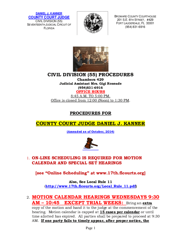 DANIEL J. KANNERBROWARD COUNTY COURTHOUSE 201 S.E. 6TH STREET, #429 FORT LAUDERDALE, FL 33301 (954) 8316916COUNTY COURT JUDGE CIVIL DIVISION (55) SEVENTEENTH JUDICIAL CIRCUIT OF FLORIDACIVIL DIVISION
