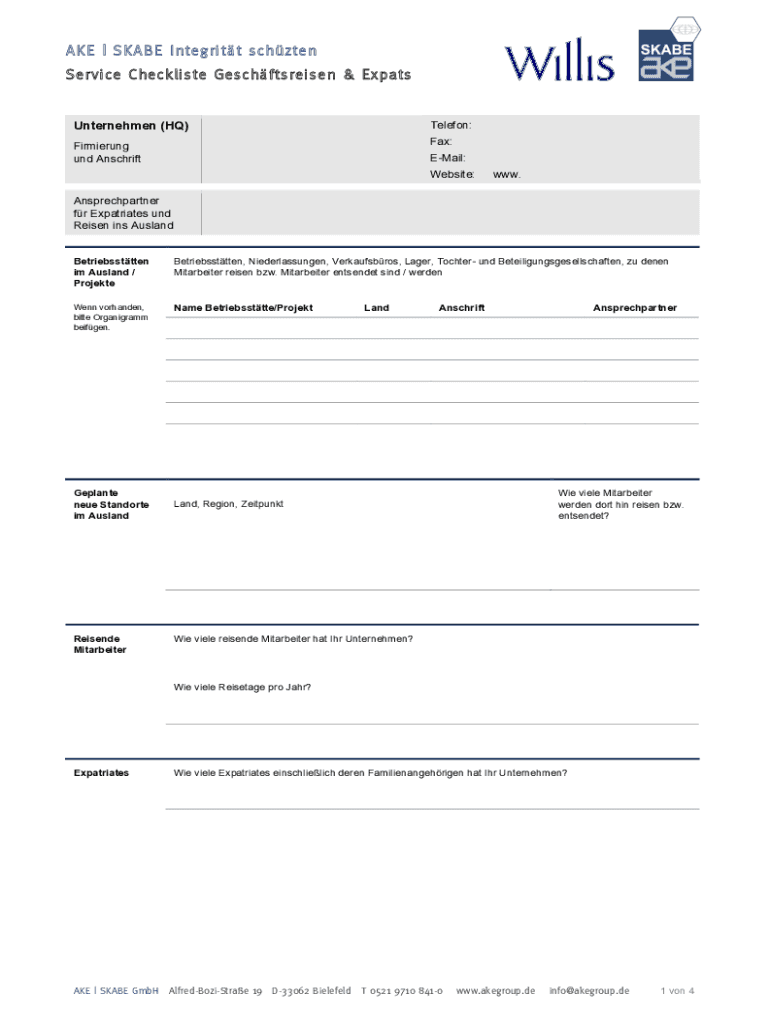 AKE | SKATE Integrity chosen Service Checklist Geschftsreisen & ExpatsTelefon: Fax:Unternehmen (HQ) Firming UND AnschriftEMail: Website:www.Ansprechpartner for Expatriates UND Risen ins Husband Betriebssttten