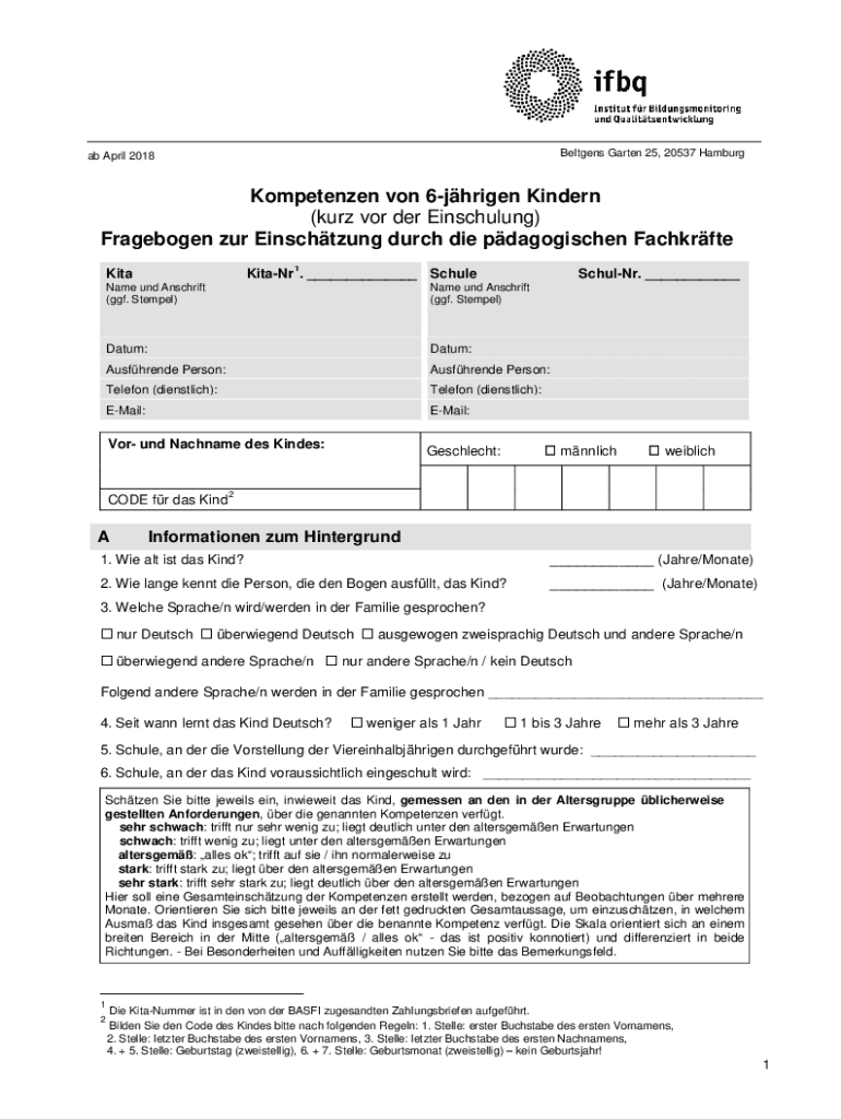 Belt gens Garden 25, 20537 Hamburg ab April 2018Kompetenzen on 6jhrigen Kinder (Kurt VOR her Einschulung) Fragebogen our Einschtzung Dutch die pdagogischen Fachkrfte 1KitaKitaNr. ___ SchuleSchulNr.