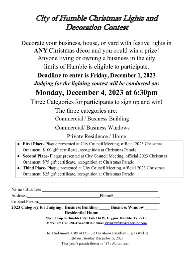 City of Humble Christmas Lights and Decoration Contest Decorate your business, house, or yard with festive lights in ANY Christmas door, and you could win a prize! Anyone living or owning a business