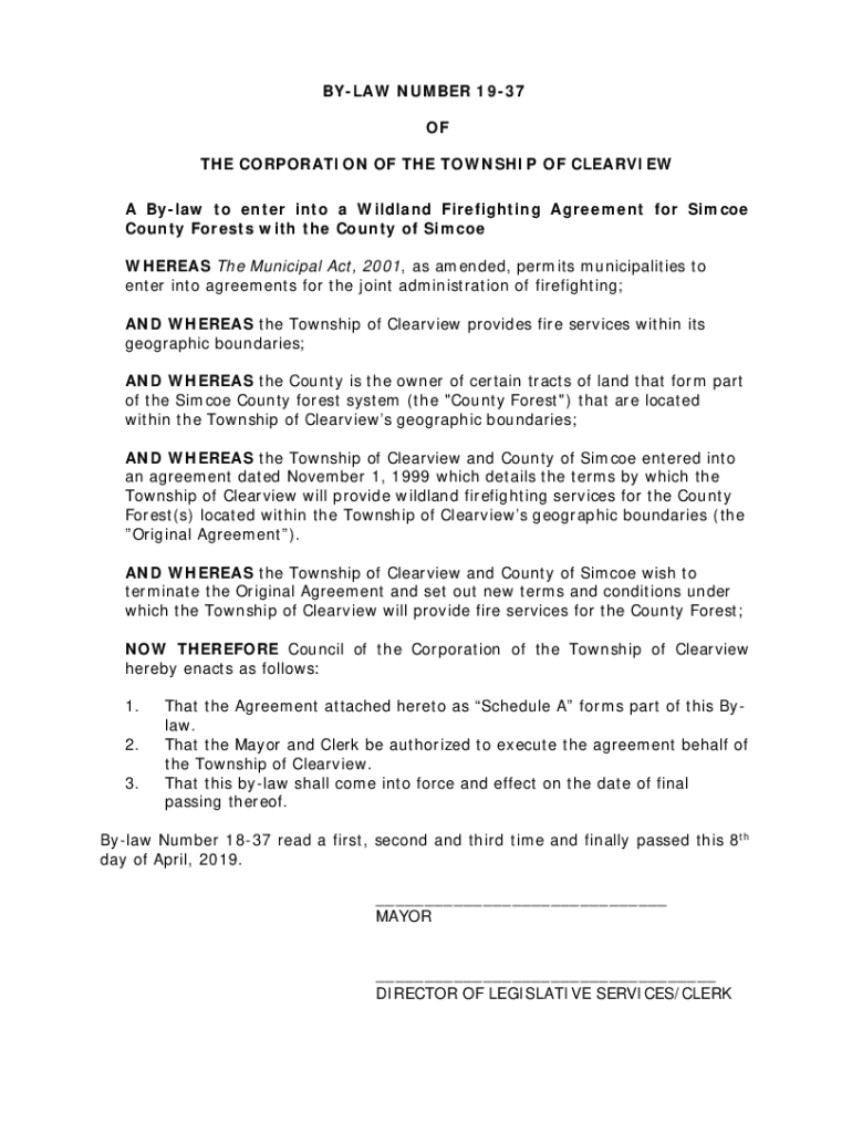 BYLAW NUMBER 1937 OF THE CORPORATION OF THE TOWNSHIP OF CLEARVIEW A Bylaw to enter into a Wild land Firefighting Agreement for Since County Forests with the County of Since WHEREAS The Municipal Act,