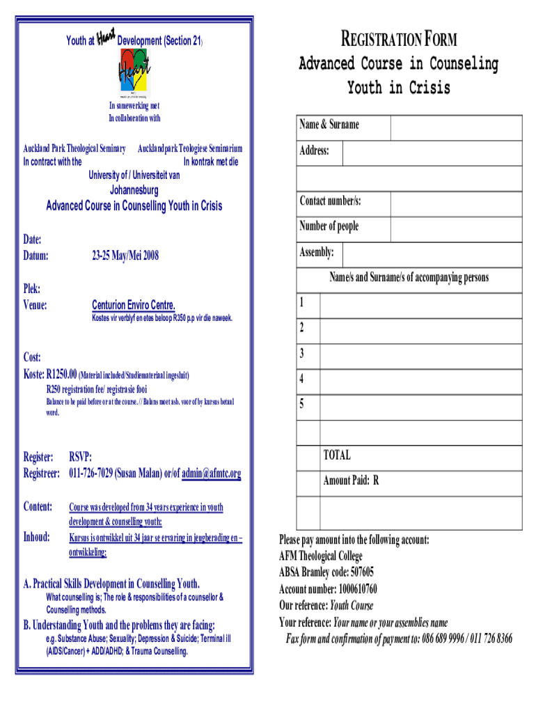 Youth registration Redevelopment (Section 21)Advanced Course in Counseling Youth in Crisis In skewering met In collaboration with Auckland Park Theological Seminary Auckland park Theologies Seminaries