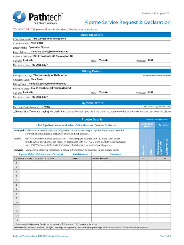 Revision 10 August 2021Pipette Service Request & Declaration TO AVOID DELAYS please fill out both sides of this form in its entiretyShipping Details Company Name: The University of Melbourne Contact