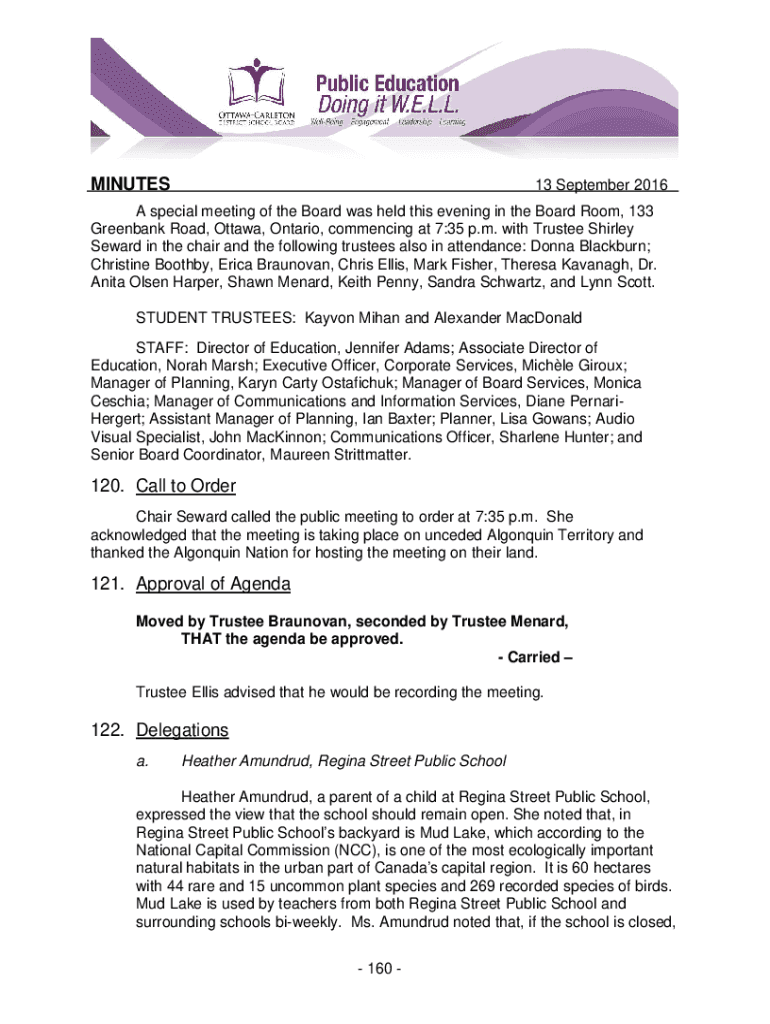 MINUTES13 September 2016A special meeting of the Board was held this evening in the Board Room, 133 Greenback Road, Ottawa, Ontario, commencing at 7:35 p.m. with Trustee Shirley Seward in the chair