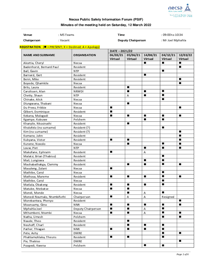 Venue: MS Teatime: 09:00 to 10:34Chairperson: VacantDeputy Chairperson: Mr Joel MphahlaREGISTRATION