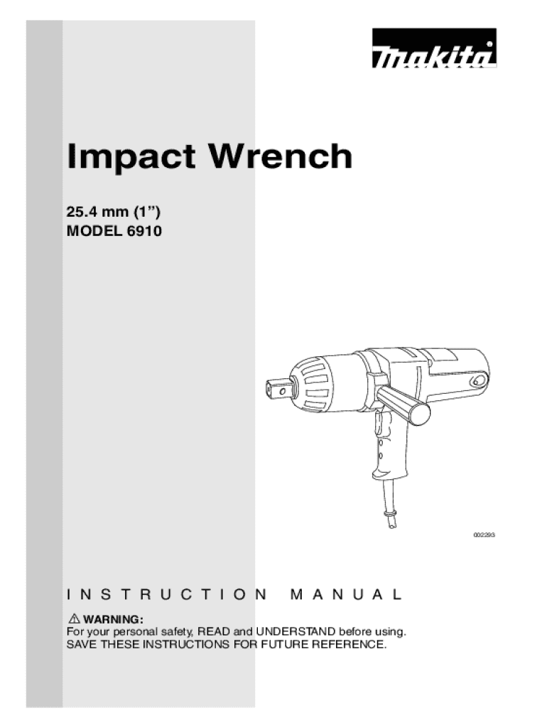 Impact Wrench 25.4 mm (1) MODEL 6910002293I N S T R U C T I O NM A N U A LEARNING: For your personal safety, READ and UNDERSTAND before using. SAVE THESE INSTRUCTIONS FOR FUTURE REFERENCE.SPECIFICATIONS