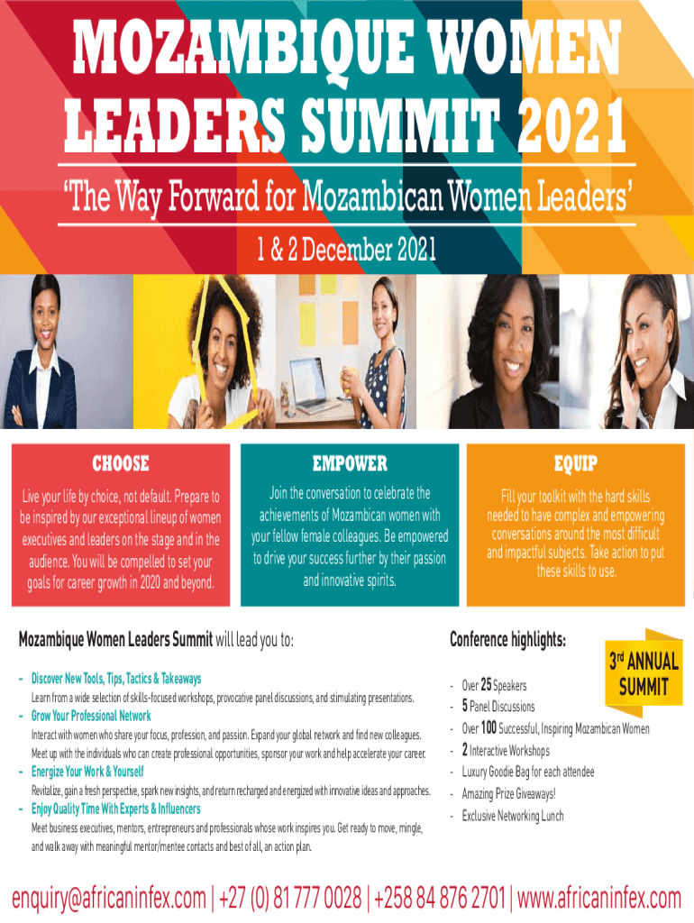 MOZAMBIQUE WOMEN LEADERS SUMMIT 2021The Way Forward for Mozambican Women Leaders 1 & 2 December 2021CHOOSEEMPOWEREQUIPLive your life by choice, not default. Prepare to be inspired by our exceptional