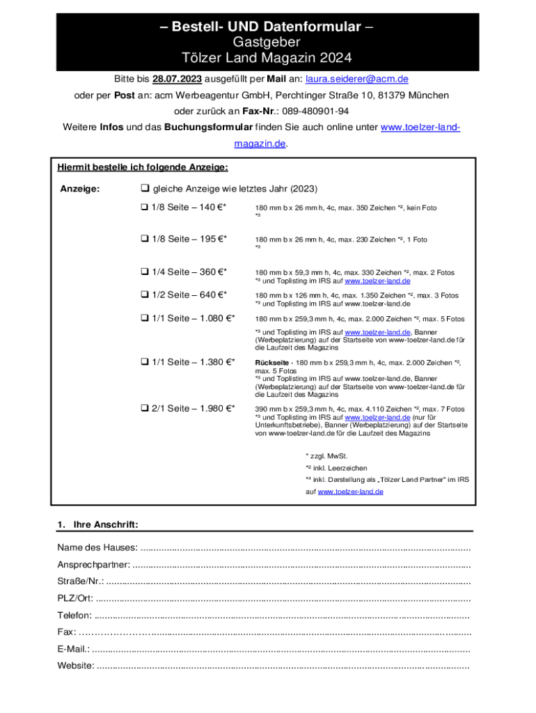 Bestell UND Datenformular Gastgeber Tlzer Land Magazin 2024 Bitte bis 28.07.2023 ausgefllt per Mail an: laura.seiderer@acm.de oder per Post an: acm Werbeagentur GmbH, Perchtinger Strae 10, 81379 Mnchen