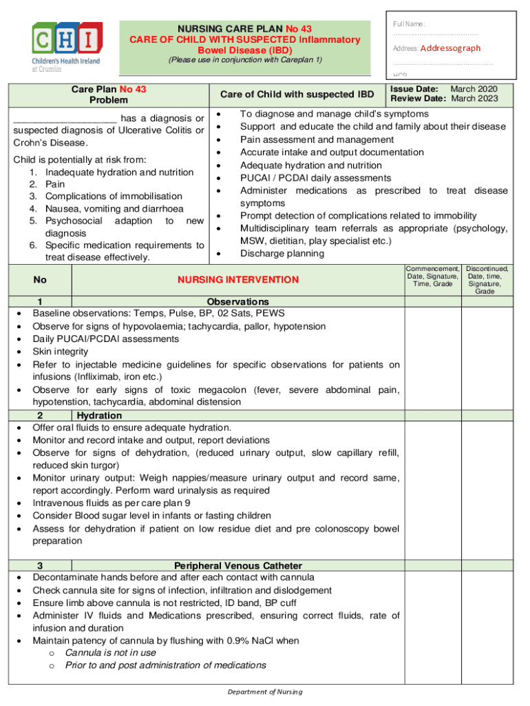 NURSING CARE PLAN No 43 CARE OF CHILD WITH SUSPECTED Inflammatory Bowel Disease (IBD) (Please use in conjunction with Care plan 1)Care Plan No 43 Problematic of Child with suspected IBD___ has a diagnosis