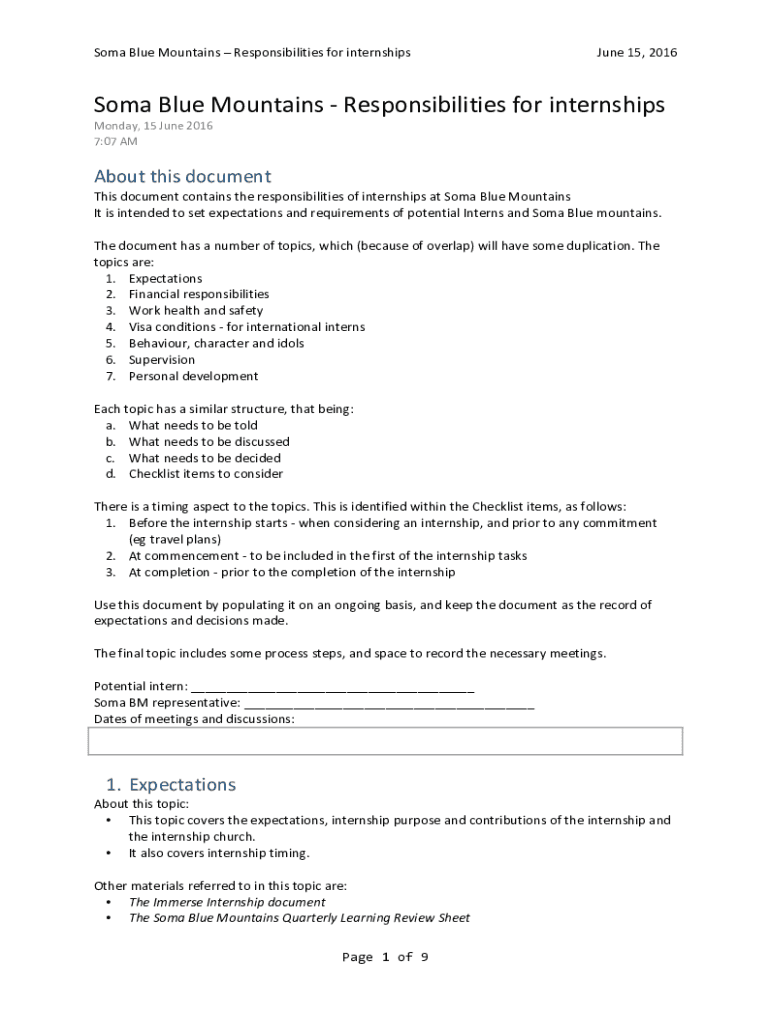 SOMA Blue Mountains Responsibilities for internships June 15, 2016Soma Blue Mountains Responsibilities for internships Monday, 15 June 20167:07 AMA bout this documents document contains the responsibilities of internships at SOMA Blue Mountains