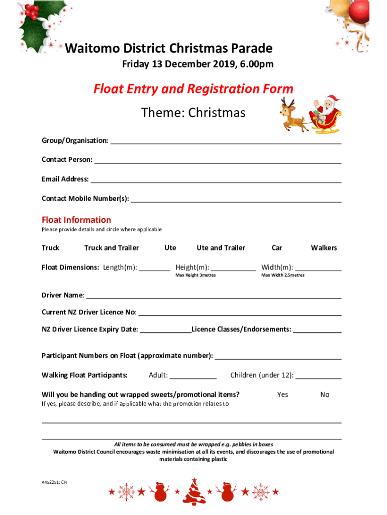 WaitomoDistrictChristmasParade Friday13December2019,6.00pm FloatEntryandRegistrationForm Theme:Christmas Group/Organization: ContactPerson: Misaddress: ContactMobileNumber(s):FloatInformation Pleaseprovidedetailsandcirclewhereapplicable