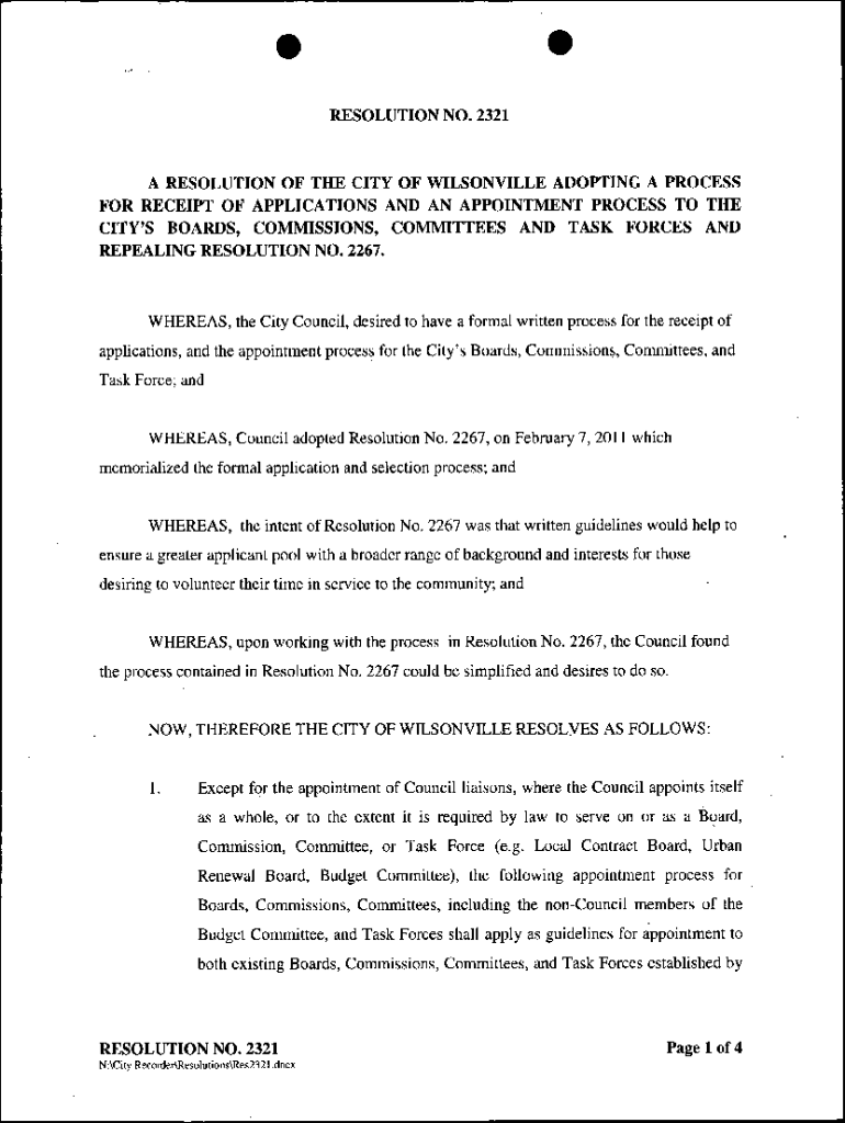 RESOLUTION NO. 2321A RESOLUTION OF THE CITY OF WILSONVILLE ADOPTING A PROCESS FOR RECEIPT OF APPLICATIONS AND AN APPOINTMENT PROCESS TO THE CITY\'S BOARDS, COMMISSIONS, COMMITTEES AND TASK FORCES