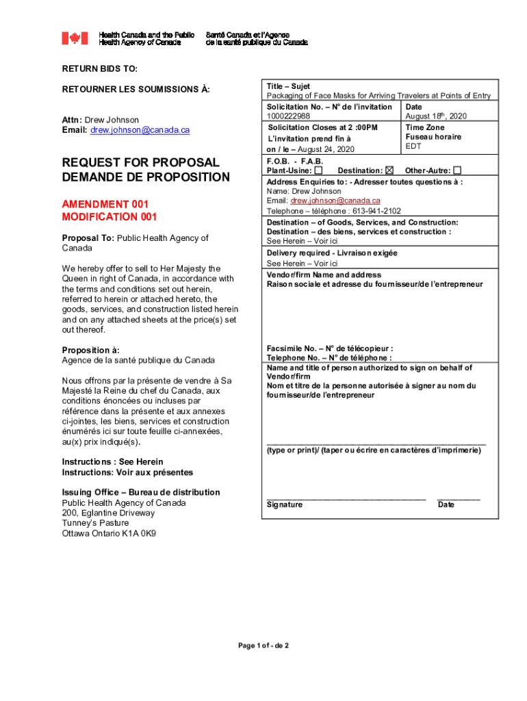 RETURN BIDS TO: RETURNER LES COMMISSIONS : Attn: Drew Johnson Email: drew.johnson@canada.caREQUEST FOR PROPOSAL DEMAND DE PROPOSITION AMENDMENT 001 MODIFICATION 001 Proposal To: Public Health Agency
