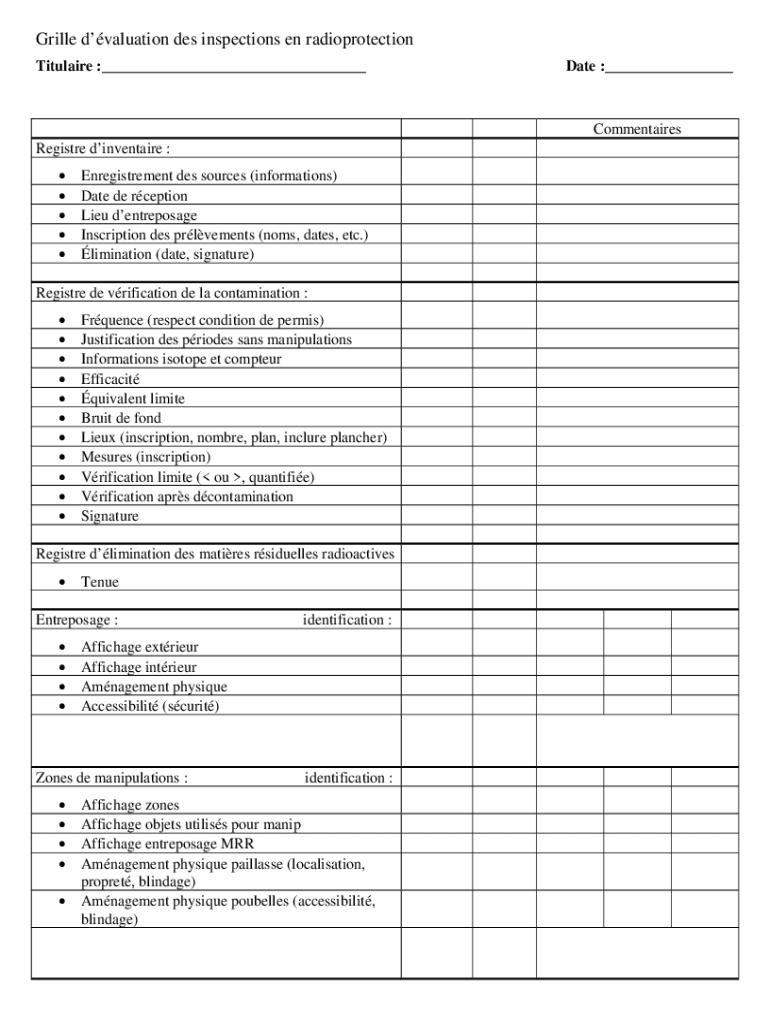 Grilled valuation DES inspections en radio protection Titular :___Date :___Commentaries Register inventive : Enregistrement DES sources (information) Date de reception Lieu dentreposage Inscription