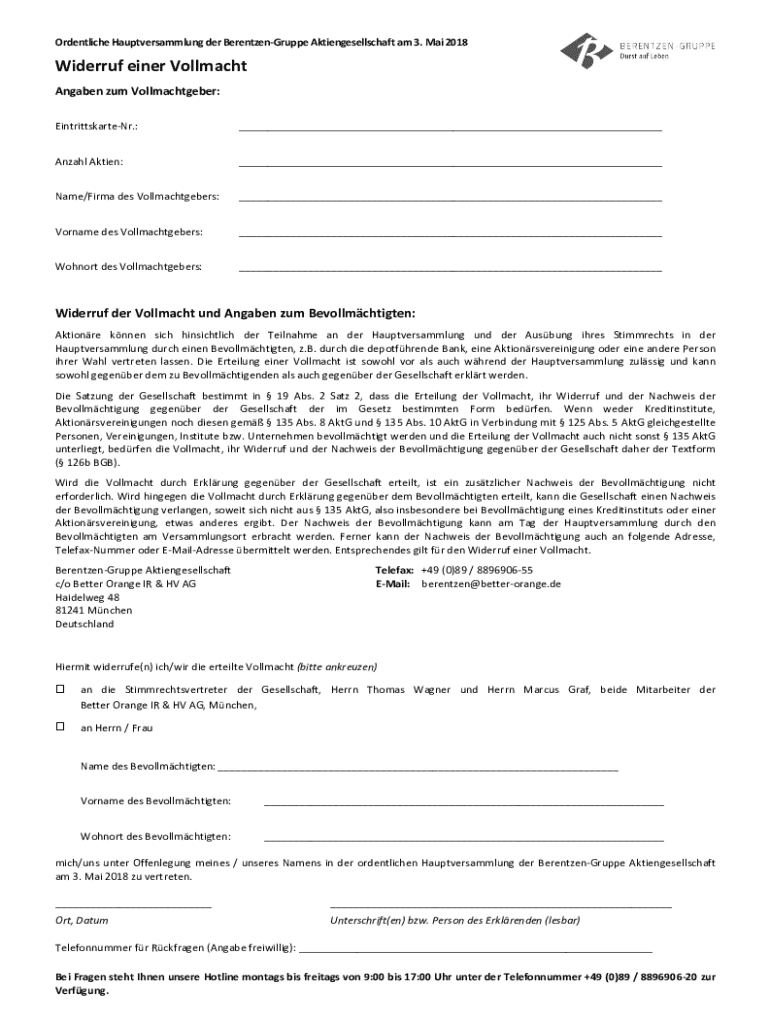 OrdentlicheHauptversammlungderBerentzenGruppeAktiengesellschaftam3. Mai2018WiderrufeinerVollmacht