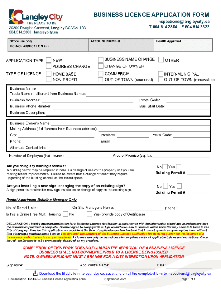 BUSINESS License APPLICATION FORMinspections@langleycity.ca T 604.514.2804 F 604.514.2322Office use only License APPLICATION FEE:ACCOUNT NUMBERHealth ApprovalAPPLICATION TYPE:NEW ADDRESS CHANGEBUSINESS