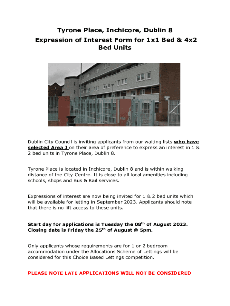 Tyrone Place, Incisors, Dublin 8 Expression of Interest Form for 1×1 Bed & 4×2 Bed Units Dublin City Council is inviting applicants from our waiting lists who have selected Area J on their area