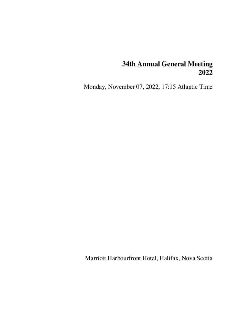 34th Annual General Meeting 2022 Monday, November 07, 2022, 17:15 Atlantic Time Marriott Harbourfront Hotel, Halifax, Nova ScotiaCWWA Annual General Meeting November 07, 2022Item 01 AgendaCANADIAN