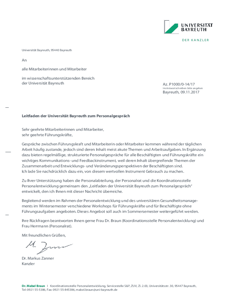 DER KANZLER Universitt Bayreuth, 95440 BayreuthAn alle Mitarbeiterinnen und Mitarbeiter im wissenschaftsuntersttzenden Bereich der Universitt BayreuthAz. P1000/014/17 Im Antwortschreiben bitte angebenBayreuth,