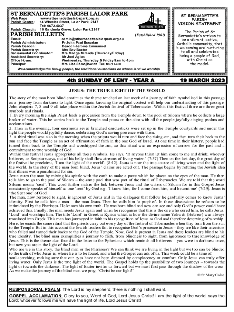 ST BERNADETTES PARISH LALOR PARK Web Page: Parish Centre:Parish Church:ST BERNADETTES PARISH VISION STATEMENTwww.stbernadetteslalorpark.org.au 14 Wheeler Street, Lalor Park, 2147 Tel: 9672.4037 10