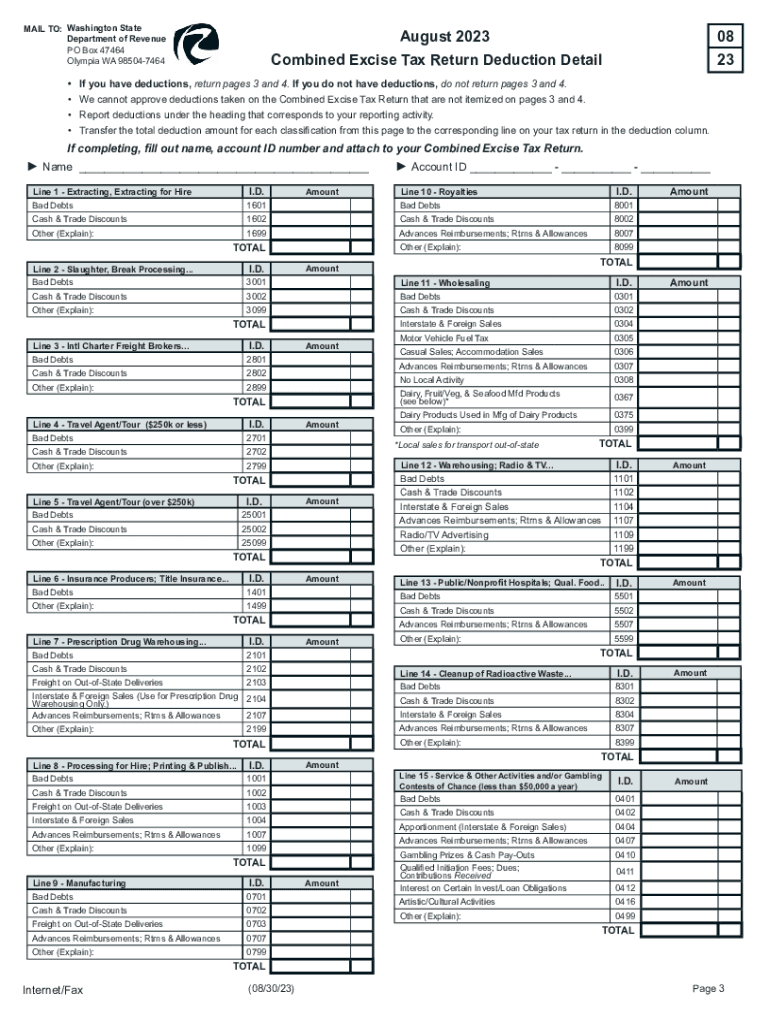 MAIL TO: Washington State Department of Revenue PO Box 47464 Olympia WA 985047464August 202308Combined Excise Tax Return Deduction Detail23If you have deductions, return pages 3 and 4. If you do not