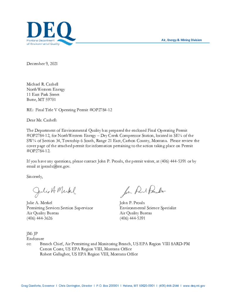 Air, Energy & Mining Division December 9, 2021Michael R. Ca shell Northwestern Energy 11 East Park Street Butte, MT 59701 RE: Final Title V Operating Permit #OP278412 Dear Mr. Ca shell: The Department