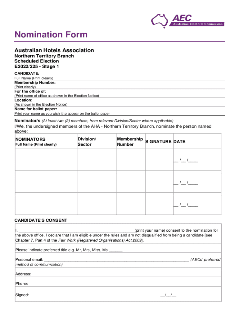 Nomination Form Australian Hotels Association Northern Territory Branch Scheduled Election E2022/225 Stage 1 CANDIDATE: Full Name (Print clearly)Membership Number: (Print clearly)For the office of: