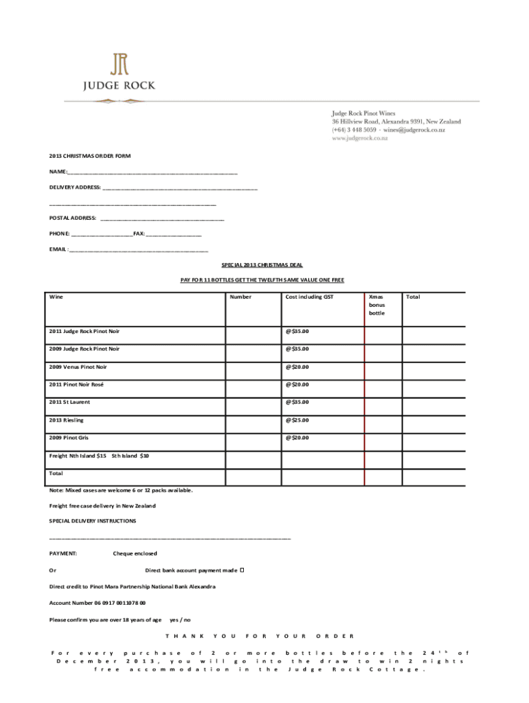 2013 CHRISTMAS ORDER FORM NAME:___ DELIVERY ADDRESS: ___ ___ POSTAL ADDRESS: ___ PHONE: ___FAX: ___ EMAIL :___ SPECIAL 2013 CHRISTMAS DEAL PAY FOR 11 BOTTLES GET THE TWELFTH SAME VALUE ONE FREE WineNumberCost