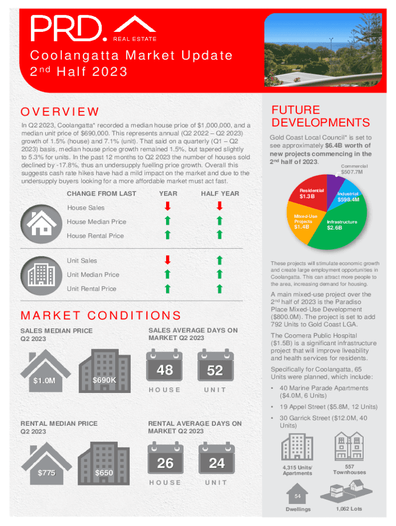 In Q2 2023, Coolangatta* recorded a median house price of $1,000,000, and a