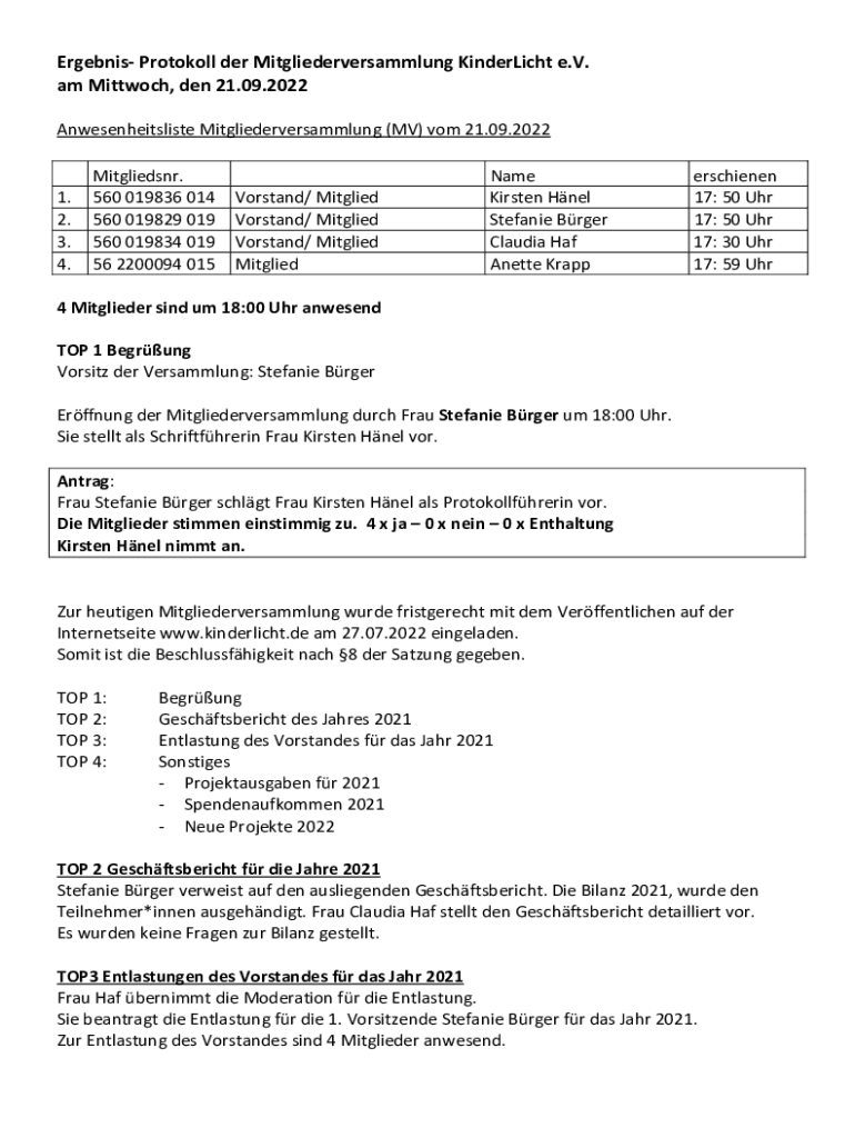 Holen Sie sich kostenlos Ergebnis- Protokoll der Mitgliederversammlung KinderLicht e