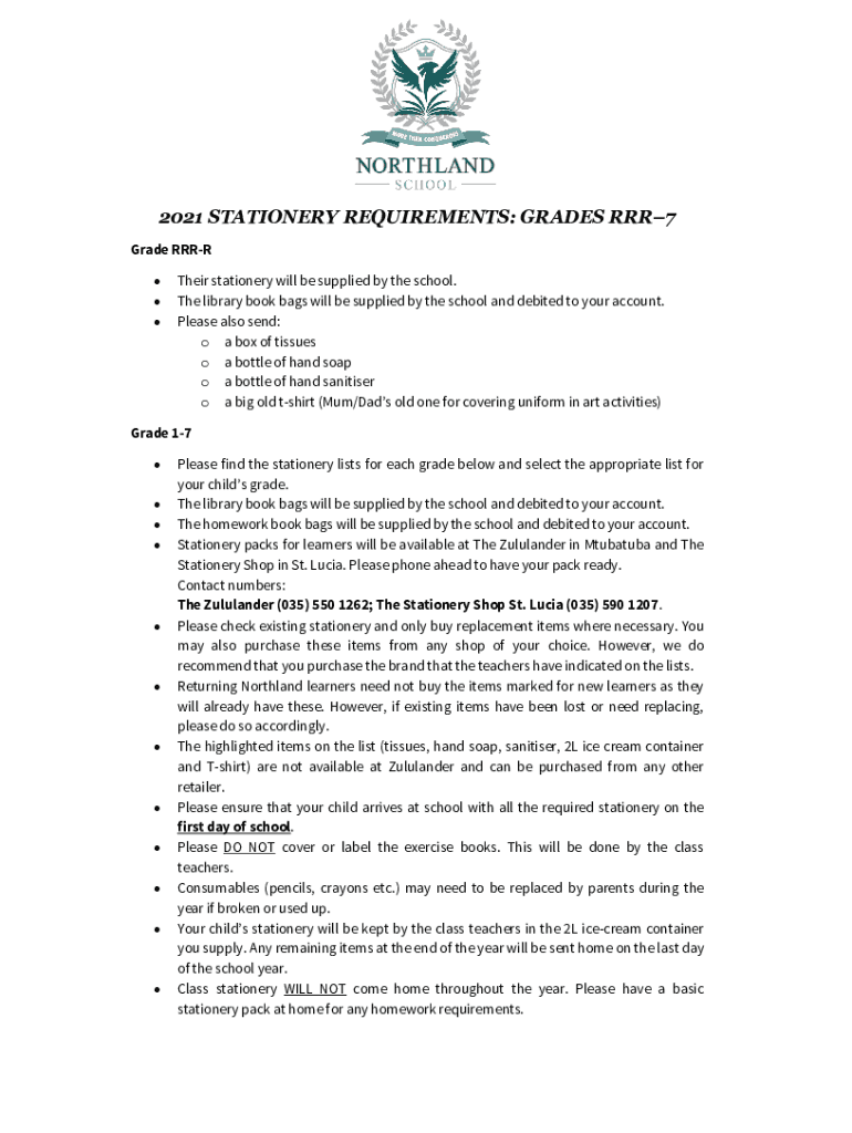 2021 STATIONERY REQUIREMENTS: GRADES RRR7 Grade RRR Their stationery will be supplied by the school. The library book bags will be supplied by the school and debited to your account. Please also send: