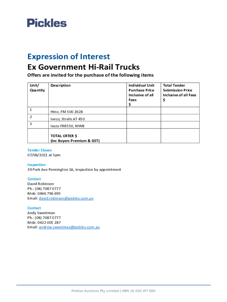 Expression of Interest Ex Government Rail Trucks Offers are invited for the purchase of the following items Unit/ Quantity1 2 3DescriptionHino, FM 500 2628 Veto, Strain AT 450 Isuzu FRR550, MOB TOTAL