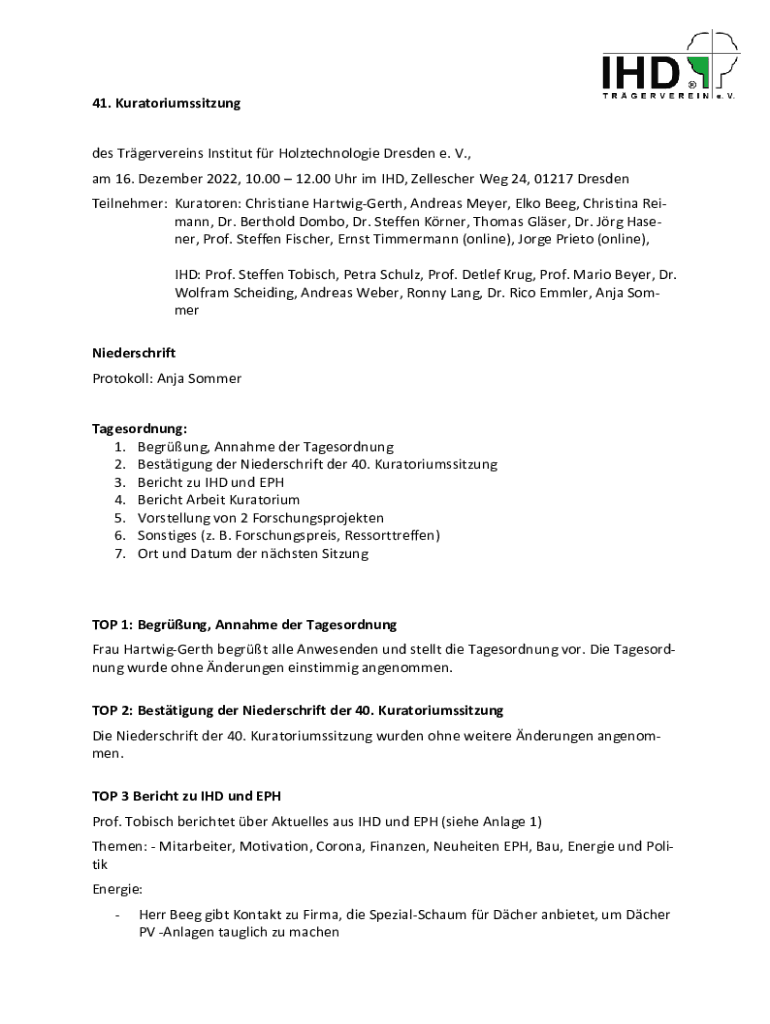 41. Kuratoriumssitzung desTrgervereinsInstitutfrHolztechnologieDresdene. V., am16. Dezember2022,10.0012.00UhrimIHD,ZellescherWeg24,01217Dresden Teilnehmer: Curator:ChristianeHartwigGerth, AndreasMeyer,
