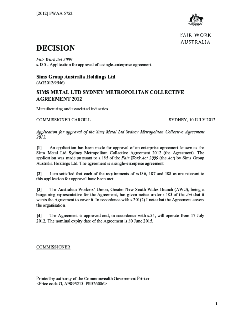 Get the free Sims Metal Ltd Sydney Metropolitan Collective Agreement 2012 ...