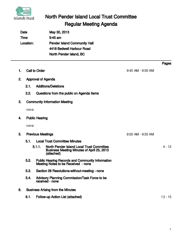 North Gender Island Local Trust Committee Regular Meeting Agenda Date May 30, 2013Time9:45 allocation:Gender Island Community Hall 4418 Be dwell Harbor Road North Gender Island, BC Pages1. Call to