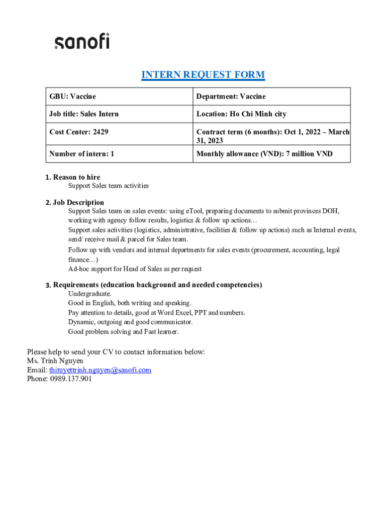 INTERN REQUEST FORM GBU: VaccineDepartment: Vaccine Job title: Sales Interrogation: Ho Chi Minh cityCost Center: 2429Contract term (6 months): Oct 1, 2022 March 31, 2023Number of intern: 1Monthly