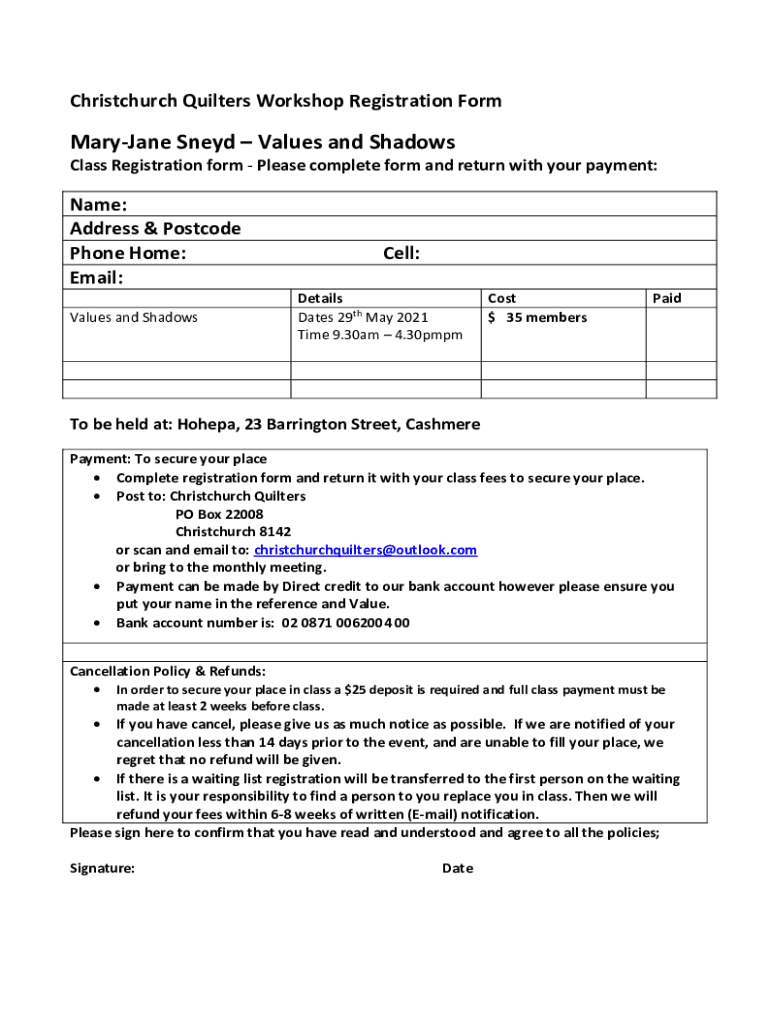 Christchurch Quilters Workshop Registration FormMaryJane Snap Values and Shadows Class Registration form Please complete form and return with your payment:Name: Address & Postcode Phone Home: Email: