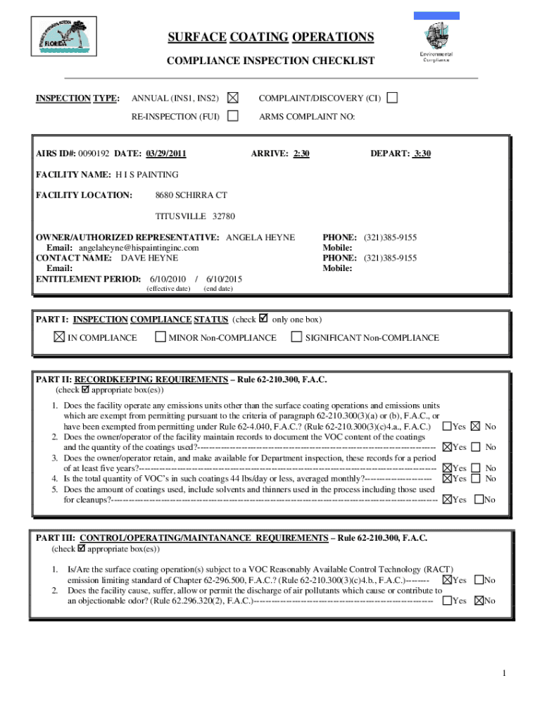 SURFACE COATING OPERATIONS COMPLIANCE INSPECTION CHECKLISTINSPECTION TYPE:ANNUAL (INS1, INS2)COMPLAINT/DISCOVERY (CI)INSPECTION (FBI)ARMS COMPLAINT NO:AIRS ID#: 0090192 DATE: 03/29/2011ARRIVE: 2:30DEPART: