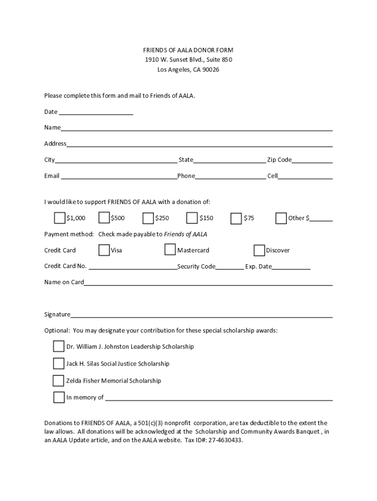 Get the free FRIENDS OF AALA DONOR FORM 1910 W. Sunset Blvd., ...
