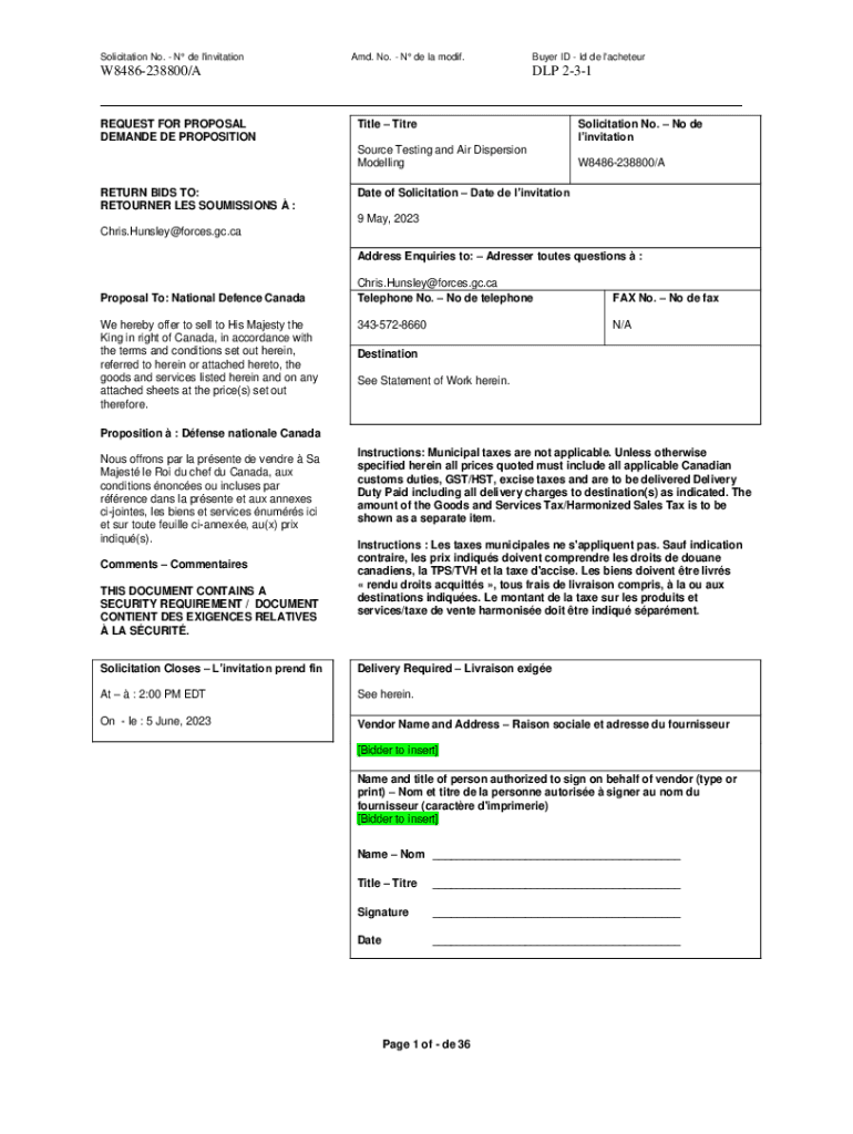 Solicitation No. N de l\'invitational. No. N de la modify. W8486238800/REQUEST FOR PROPOSAL DEMAND DE PROPOSITIONBuyer ID I'd de l\'acheteurDLP 231Title TitreSolicitation No. No de linvitationSource
