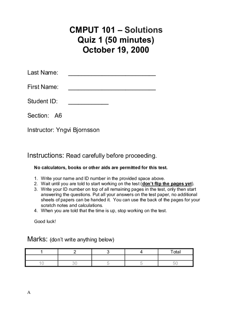 CMPUT 101 Solutions Quiz 1 (50 minutes) October 19, 2000 Last Name:___First Name:___Student ID:___Section: A6 Instructor: Yngvi BjornssonInstructions: Read carefully before proceeding. No calculators,