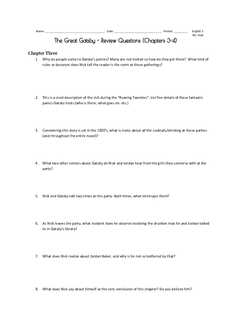 Name: ___ Date: ___ Period: ___English 3 Mr. HartThe Great Gatsby Review Questions (Chapters 34) Chapter Three 1.Why do people come to Gatsby\'s parties? Many are not invited so how do they get there?