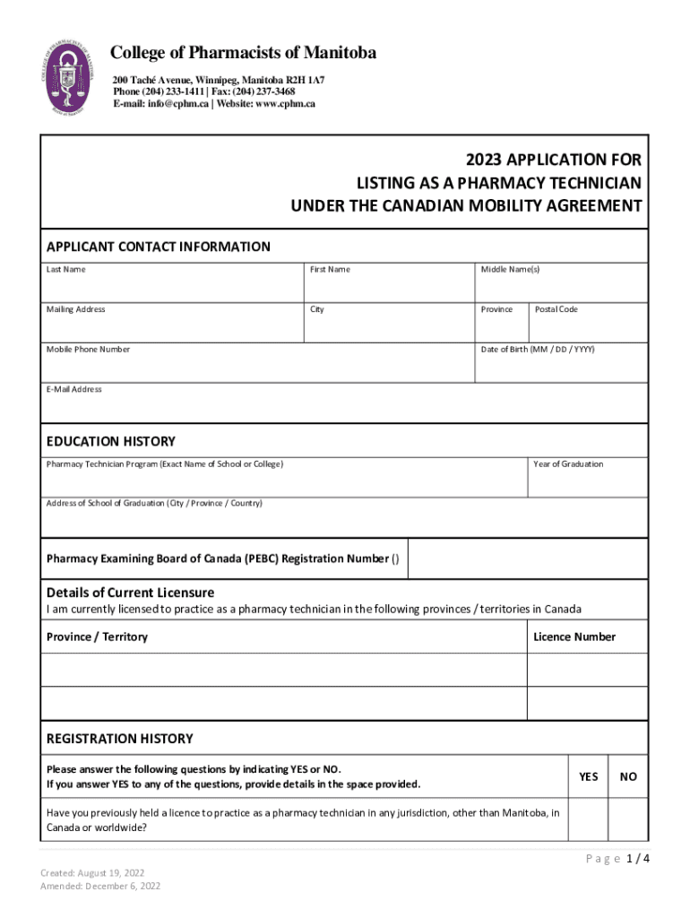 Get the free 2023 APPLICATION FOR LISTING AS A PHARMACY TECHNICIAN UNDER THE CANADIAN MOBILITY AG...