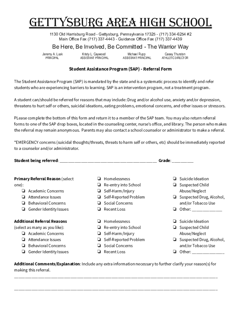 The SAP referral form is typically filed by teachers, counselors, or school administrative staff who identify students needing additional support.