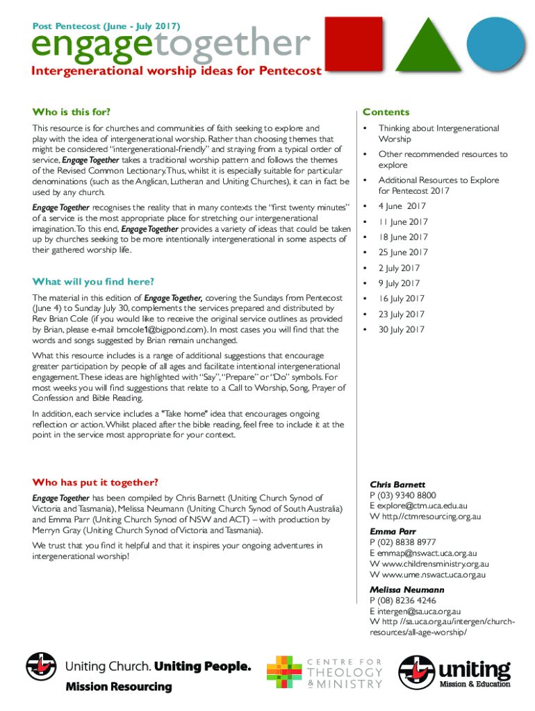 engagetogether Post Pentecost (June July 2017)Intergenerational worship ideas for Pentecost Who is this for?ContentsThis resource is for churches and communities of faith seeking to explore and play